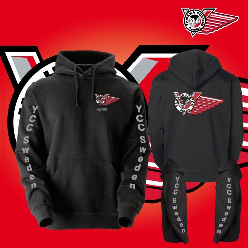 Svart huvtröja med YCC Sweden i grått på ärmarna och Yamaha Custom Club logo på vänster bröst och rygg i fyrfärg. samt region på vänster bröst