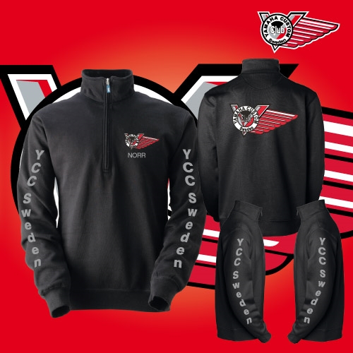Armtryck med YCC Sweden i grått och Yamaha Custom Club logo på vänster bröst och rygg i fyrfärg. samt region på vänster bröst