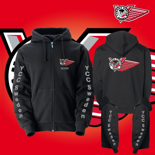 Armtryck med YCC Sweden i grått och Yamaha Custom Club logo på vänster bröst och rygg i fyrfärg. samt region på vänster bröst